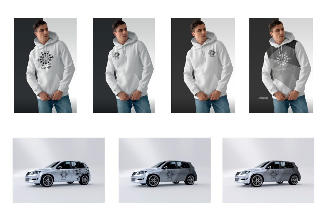 Ci-contre, vous pouvez voir différentes propositions sur les différents visuels, notamment un sweatshirt, une voiture, une chaise longue ainsi qu’une bannière.